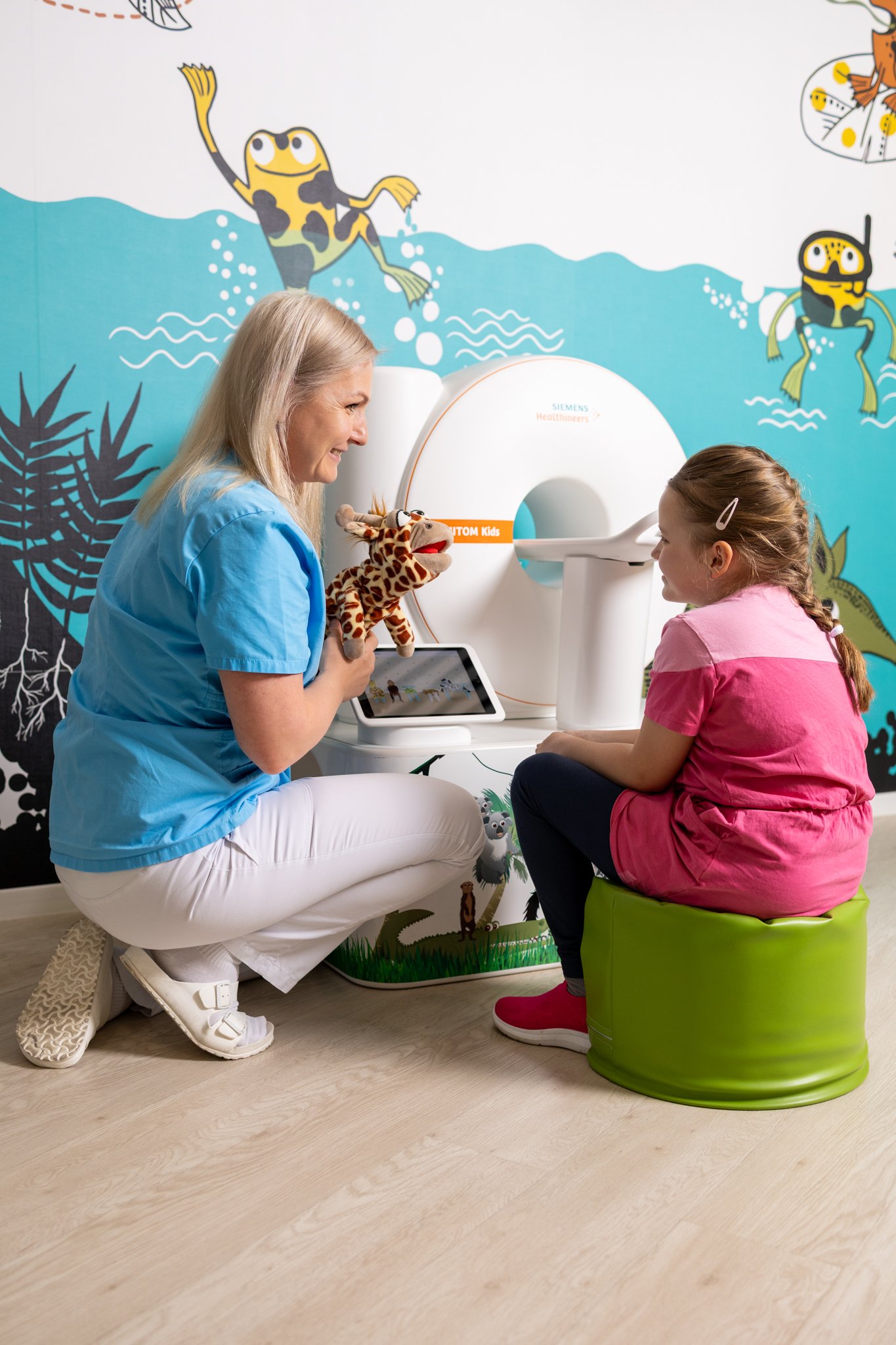 MINITOM Kids je zmenšený a interaktivní model obou přístrojů, díky kterému si děti mohou vyzkoušet roli malého radiologického asistenta. V tunelu „vyšetřují“ plyšovou žirafu nebo pandu a přirozeně se tak seznámí s tím, co je čeká. Hrou si tak přirozeně osvojí, co je při skutečném vyšetření čeká, a celý proces pro ně přestává být neznámou či stresující zkušeností.