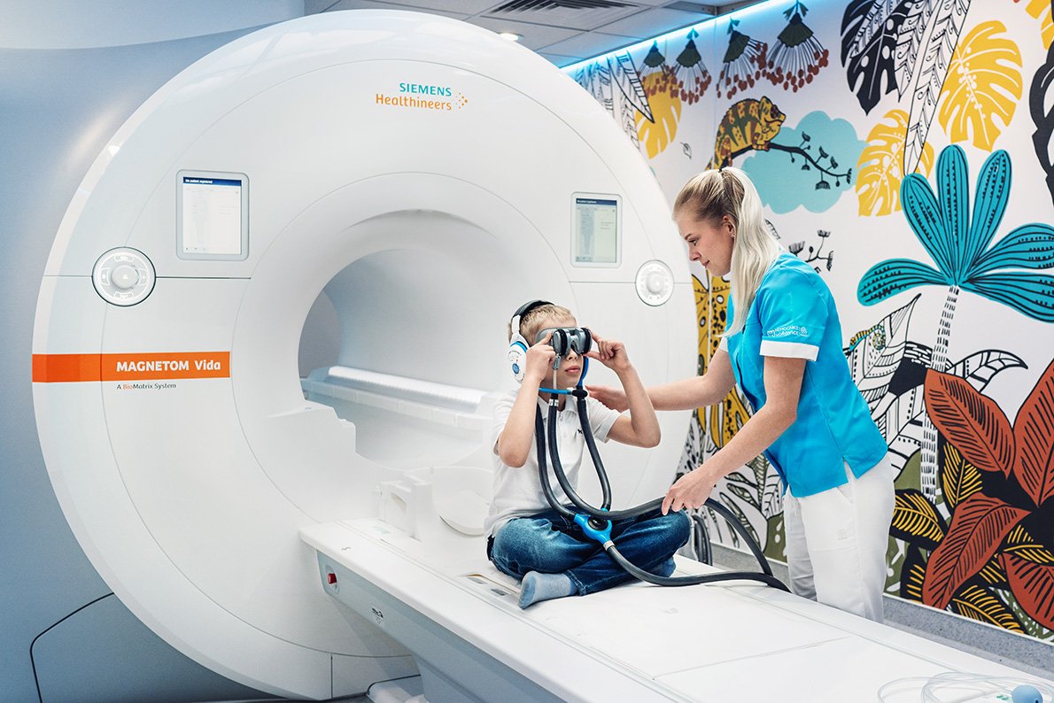 Jsme zároveň jediným diagnostickým pracovištěm, které při vyšetření magnetickou rezonancí radikálně snižuje podávání sedativ nebo anestézie kvůli zabránění nežádoucího pohybu. Při skenování totiž používáme unikátní zábavní systém, který udržuje pacienty v nehybné poloze. Během vyšetření tak mohou sledovat třeba svůj oblíbený televizní pořad nebo film. Integrovaný mikrofon pak v případě potřeby umožňuje kontakt s rentgenologem.